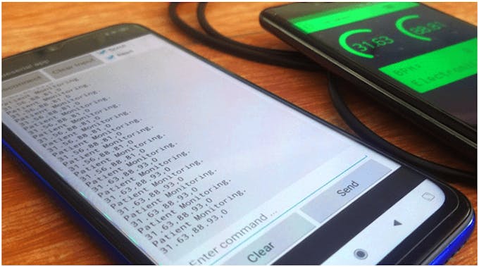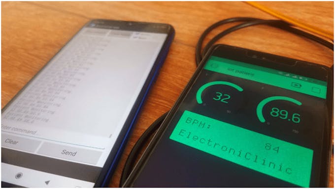 En este proyecto, dos células diferentes aplicaciones del teléfono se utiliza para el monitoreo de la temperatura del paciente y BPM «Beats Per Minute». Una aplicación está diseñada en Blynk, mientras que la otra aplicación de teléfono celular está diseñada en Android Studio.,