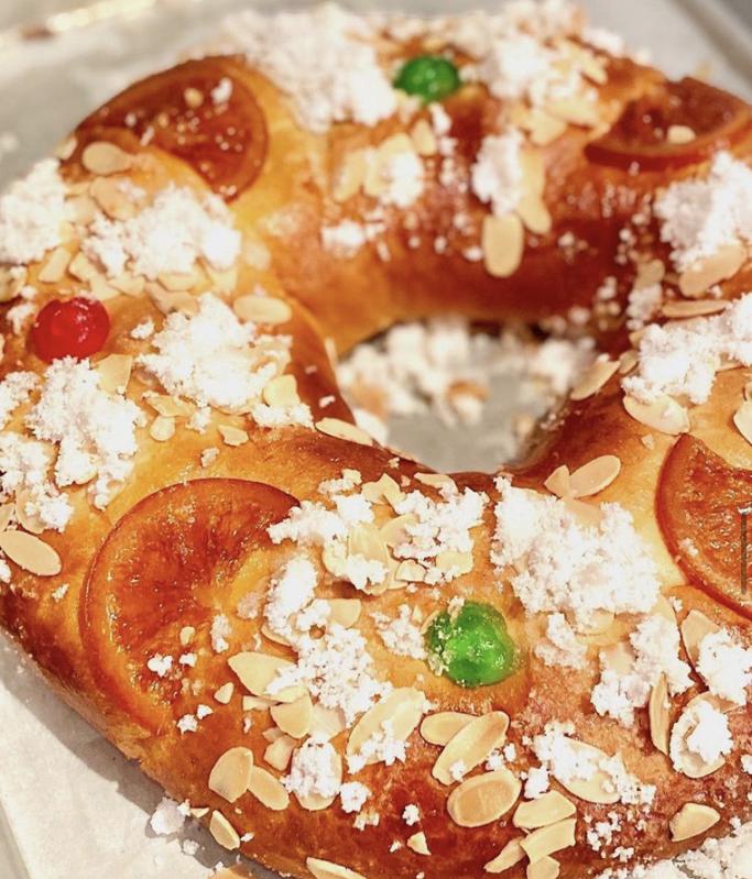 “Roscón de Reyesは、6月のel Día de los Reyes Magos、またはEpiphanyの前夜または朝に提供されます。 ベースはブリオッシュのような生地で、豊かで軽く、オレンジ色の花の水の香りがし、ドライフルーツ、アーモンド、砂糖で飾られています。