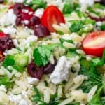 この20分の地中海オルゾサラダレシピは、トマト、ピーマン、新鮮なハーブ、クリーミーなフェタ、ブリニーオリーブのような大きな味がロードされ、大胆なレモン そして、私はちょうどそれが迅速かつ健康的な夕食のためにあなたの選択のあなたのタンパク質の隣に簡単なベジタリアンランチや側としてどの それは一年中大きな家族のお気に入りです、そして私はあなたがそれを試してみるのを待つことはできません!