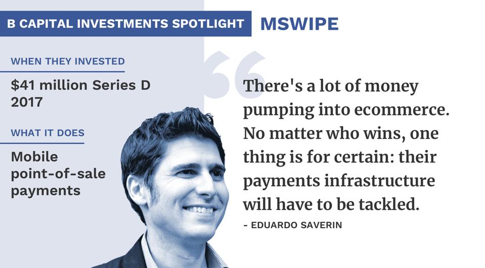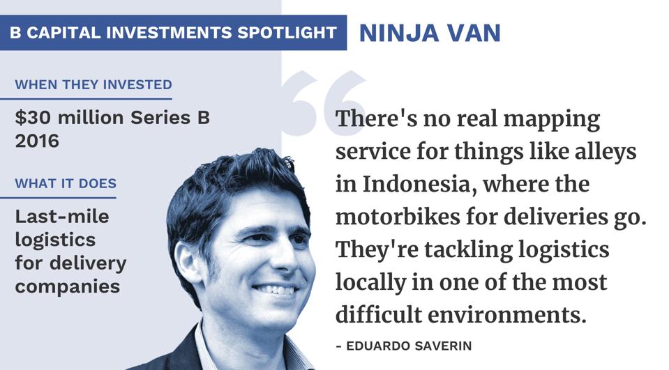 Ett eksempel: Ninja Van. En siste mil logistikk leverandør for levering av tjenester i Sørøst-Asia, Singapore-baserte oppstart sysselsetter over 2000 mennesker, og fungerer med 10.000 drivere. Det er et dyrt, komplisert virksomhet, men B Kapital steppet inn for å skrive en sjekk når andre balked., «Eduardo og teamet stilte de rette spørsmålene, sier Lai Wen Chang, leder av Ninja Van. «De er i stand til å gi oss et bredere perspektiv på tvers av virksomhetsområder og geografiske områder.»