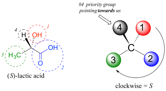 com as nossas prioridades atribuídas, olhamos em seguida para o grupo de prioridade #4 (o hidrogênio) e vemos que ele é apontado de volta para longe de nós, no plano da página – assim passo 4a do procedimento acima se aplica., Em seguida, traçamos um círculo definido pelos grupos de prioridade #1, #2, e #3, em ordem crescente. O círculo é no Sentido DOS ponteiros do relógio, que pela etapa 4a nos diz que este carbono tem a configuração ‘R’, e que esta molécula é (R)-gliceraldeído. O seu enantiómero, por definição, deve ser (s) – gliceraldeído.em seguida, vamos olhar para um dos enantiômeros do ácido láctico e determinar a configuração do centro quiral. Claramente, H é o substituinte # 4 e OH é #1. Devido às suas três ligações ao oxigênio, o carbono no grupo ácido tem prioridade #2, e o grupo metil leva #3., O grupo # 4, hidrogênio, acontece ser desenhado apontando para nós (fora do plano da Página) nesta figura, então usamos o passo 4b: o círculo traçado de #1 a #2 a #3 é no sentido horário, o que significa que o centro quiral tem a configuração S.