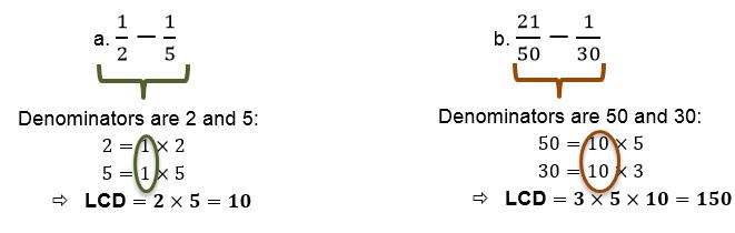 encontrar o menor denominador comum (LCD) das fracções. O LCD é o múltiplo menos comum dos denominadores.
