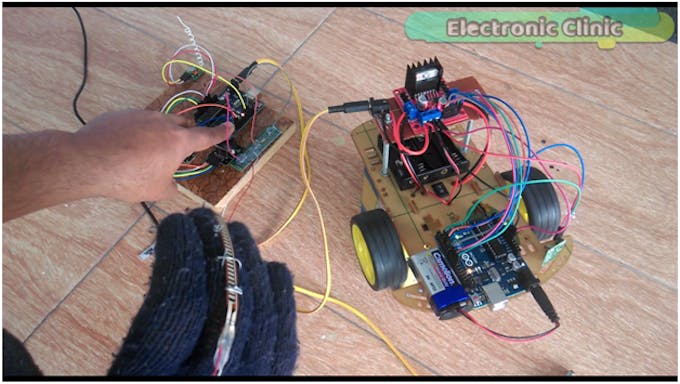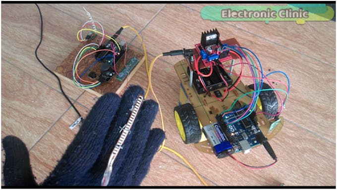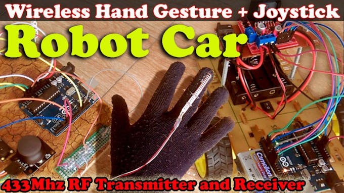 i den här handledningen lär du dig hur du gör en trådlös handstyrd robot med Arduino, L298N motor driver, flex sensor, 2-axel joystick och 433MHz RF-sändare och mottagare.,